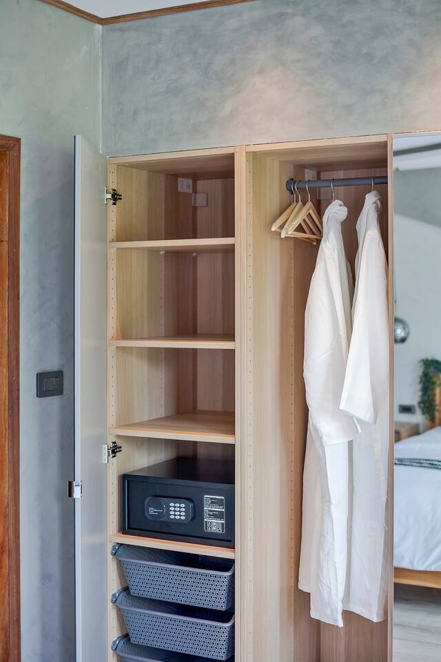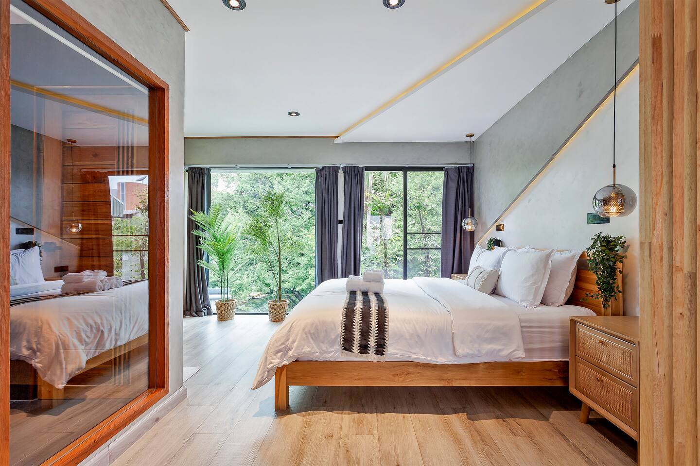 The house features a large living area on the first floor, 2 bedrooms (each with king size bed) on the second floor, and a master bedroom on the third floor. The master bedroom has one king size bed and a sofa that can cover into a queen size bed (160cm wide). Let me know if you wish to use the sofa as a bed and I will prepare it for your arrival.